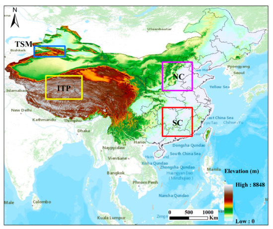 Schematic map of elevation in China. Four hotspots are marked, namely North China (NC), South China (SC), Tianshan Mountain (TSM), and the Interior of the Tibetan Plateau (ITP).