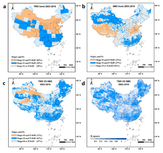 The slopes, p values (at the 5% significance level) of linear regression models over the period 2003–2016 per pixel. (a) The spatial pattern of slope in observed terrestrial water storage derived from gravity satellite dataset. (b) The spatial pattern of the slope in the observed soil moisture storage was simulated from the Global Land Data Assimilation System (GLDAS) Noah model. (c) The slope of terrestrial water storage and soil moisture storage, blue represents the same trend and red represents the opposite. (d) R2 values.