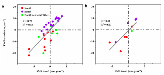 Relationship between the terrestrial water storage trends and soil moisture storage trends during 2003–2016. (a) Per the province. (b) Per the basin. At the provincial level, North refers to Beijing, Tianjin, Hebei, Henan, Shandong, Inner Mongolia, Shanxi, Heilongjiang, Jilin, and Liaoning; South refers to Jiangsu, Zhejiang, Shanghai, Anhui, Jiangxi, Fujian, Hubei, Hunan, Sichuan, Chongqing, Guizhou, Yunnan, Guangdong, and Guangxi; Northwest and Tibet refers to Shanxi, Gansu, Ningxia, Qinghai, Xinjiang, and Tibet. At the watershed level, North refers to the Yellow River, Haihe River, Huaihai River, Liaohe River, and Songhua River; South refers to the Yangtze River, Pearl River, Southeast, and Southwest River; Northwest and Tibet refers to the Northwest rivers.