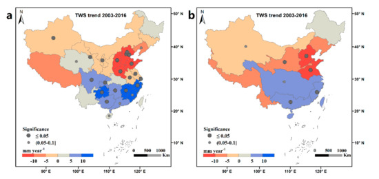 Here, we provide a comprehensive national-scale analysis of spatiotemporal variation in GRACE-based TWS during 2003–2016 in China. We demonstrate that the spatial pattern of TWS changes in China is extremely unbalanced and that geographical differentiation is prominent. Trend analysis and breakpoint analysis jointly revealed that the most general shift characterization of the space–time pattern is that TWS rapidly and continuously decreased in the North, while the TWS widely increased in the South. These results are consistent with previous studies [19,43].