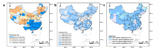 Abrupt change analysis revealed that the variation of water storage in China was diverse (Figure 5). The dominant types of breakpoints in northern China were ‘increase to decrease’, whereas in southern China were ‘increase and increase’. The major breakpoint types in western China were ‘increase to decrease’, and ‘decrease to decrease’ (Figure 5a). The average year of breakpoints on the TWS time series was 2011, and the pixels with abrupt changes from 2010 to 2014 accounted for 48% of the total pixels in China (Figure 5b). The majority of the pixels had significant abrupt changes, and non-significant (p < 0.05) changes were only 2% in China (Figure 5c). In conclusion, the results of the breakpoint algorithm also show that TWS in the north was decreasing, and in the south was increasing.