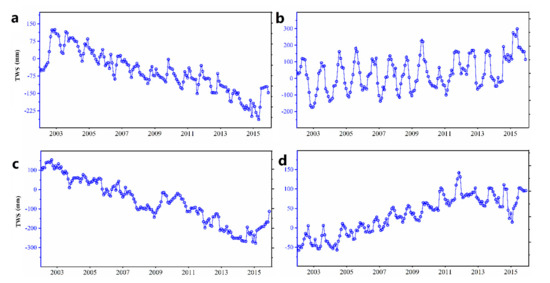 Temporal profiles of terrestrial water storage over the four hotspots. (a) North China; (b) South China; (c) Tianshan Mountains; (d) the Interior of the Tibetan Plateau.