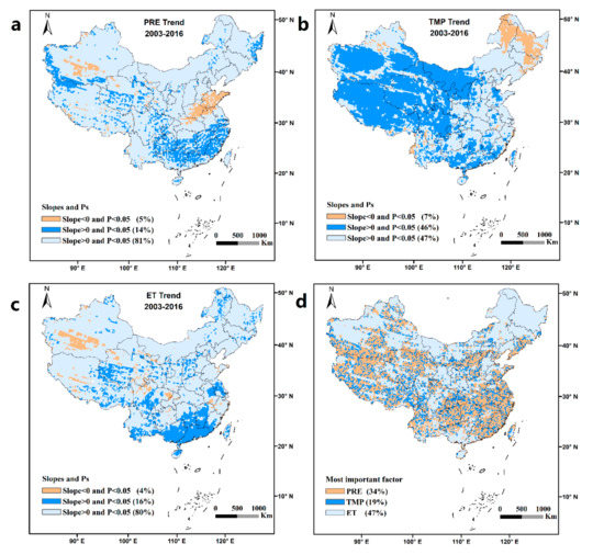 Spatial distribution pattern of the trends in environmental factor for the period 2003–2016. (a) Precipitation; (b) temperature; (c) evapotranspiration, (d) the most important environmental factor. Multiple linear regression was used to calculate the main environmental factors affecting terrestrial water storage at the pixel level.