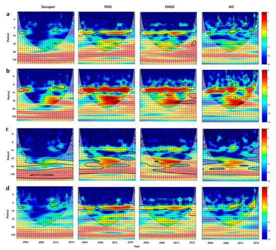 The cross-wavelet transforms between terrestrial water storage and the atmospheric circulation index as well as sunspots in the monthly time series. (a) North China; (b) South China; (c) Tianshan Mountains; (d) the Interior of the Tibetan Plateau. PDO, ENSO, and AO are abbreviations for Niño 3.4, Arctic Oscillation and Pacific Decadal Oscillation, respectively. In the cross-wavelet graph, the redder the color indicates the stronger the correlation, but bluer indicates a weaker correlation. The thin black line is the boundary of the wavelet influence cone line and is the effective spectral value area. The thick black line is the 95% confidence interval of significance level at the 5% significance level.