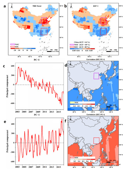 To further appreciate the importance of atmospheric circulation caused by sea surface temperature (SST) anomalies on TWS, we then compared the teleconnection between water storage and SST in two monsoon areas (Figure 9). The spatial structure of the dominant mode (EOF–1) obtained from EOF analysis was very similar to water storage trends for 2003–2016, which explained approximately 89% and 85% of the total squared covariance for NC and SC, respectively (Figure 9a,b). The principal component of EOF-1 corresponding to PC-1 showed that water storage in NC and SC decreased and increased continuously, respectively (Figure 9c,d), which indicated that the dominant mode represented the change rate in the water storage anomaly. Correlation analysis indicated the PC-1 and SST in the Pacific Ocean had a negative relation in NC, but had a positive relation in SC (Figure 9e,f). In particular, the water storage gain in SC was highly correlated with the rise of SST (R > 0.5).