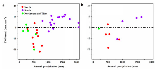 Relationship between terrestrial water storage trends and annual precipitation during 2003–2016. (a) Per the province. (b) Per the basin. For detailed meaning of the North, South, Northwest and Tibet, refer to Figure 3.