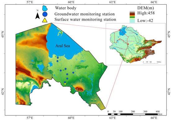The Amu Darya Delta contains both surface water and groundwater that discharge into the shrinking Large Aral Sea and ultimately control its future destiny [18]. Karakalpakstan is an autonomous republic that covers the entire northwestern of Uzbekistan. As Karakalpakstan is the primary recharge area for groundwater in Amu Darya Delta, in this paper, groundwater level data from Karakalpakstan is used to analyze the characteristics of groundwater level changes in the Amu Darya Delta. The Karakalpakstan (41°19′~45°35′ N; 56°0′~62°20′ E) has an area of 160,000 km2, the elevation ranges between −42 and 458 m, bare area and cropland are the major land use/cover types, cotton and wheat are the main crops. The Aral Sea was subdivided into two separate waterbodies, while the Amu Darya river is the sole tributary of the Large Aral Sea. which serves as the drainage for the endorheic basin.