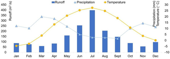 Schematic diagram of the multi-year monthly average temperature (yellow line) and precipitation (blue line) (1991–2018) at the Nukus meteorological station; and runoff (blue bar) (1992–2018) at Samanbay hydrological station. With a similar numeric range of variation, the precipitation and temperature share the secondary y-axis.
