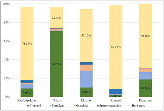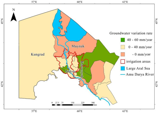 The land cover types in the study area are mainly cropland and bare areas (Figure 3), in which the groundwater varies differently. Cropland is primarily distributed around the Nukus district, and the rest is mostly bare areas. There are four main irrigation areas in the Amu Darya Delta, including Suenli, Kattagar-Bozatau, Kizketken-Kegeyli, and Kuanish Jarma, while their locations could be seen in Figure 6. According to acreage, land use type, variation characteristics, etc., four representative districts were selected for further analysis in this study. Nukus district is the capital of Karakalpakstan, where the most intensive human activities happen. Muynak district is closest to the Large Aral Sea, where the groundwater level has fallen the fastest from 1999 to 2017. Kungrad district covers the largest area in Karakalpakstan and mostly are bare areas. Part of the Karauzyak is an irrigation area, where groundwater levels have risen the fastest from 1999 to 2017.