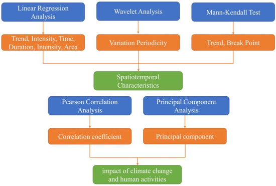 The Linear Regression Analysis is used to reveal the variation trend and intensity of groundwater level in time series. The Wavelet Analysis has been applied to identify the significant fluctuation period and extract useful information from the raw data [25,26,27,28,29]. The Non-Parametric M–K test was used to analyze the trends in the long-term groundwater level data [21,30,31]. Pearson Correlation Analysis is commonly used to analyze the relationship between two random variables [32,33]. To further identify factors that influence groundwater level in the study area, a PCA based on the five selected meteorological and hydrological parameters from the groundwater level dataset of 1999–2017 was performed [34]. Each method has a different focus while combining the results will give a comprehensive understanding of the groundwater system in the Amu Darya Delta (Figure 4).