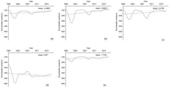 In the formula: x is the groundwater level, is the average value of the groundwater level, y represents the y-th year (1999–2017, y is from 1–19), represents the average value of y. represents the slope of the trend line [35].