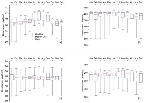 Statistical analysis (box-plot) of the monthly average groundwater level from 1999 to 2017 in Nukus (a), Karauzyak (b), Muynak (c), Kungrad (d).