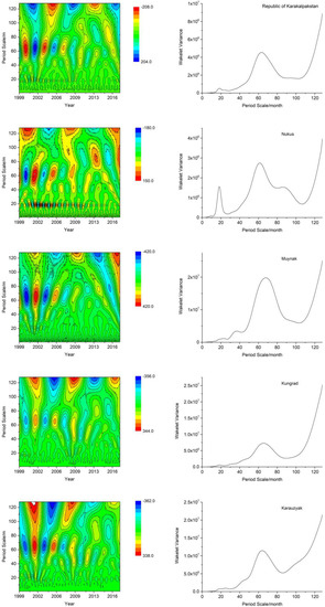 To further identify the periodic components of the Amu Darya Delta hydrological sequence and its distribution in the time domain, Morlet wavelets function with the good locality in the time domain and frequency domain are selected in this study for periodic analysis of the monthly mean groundwater level sequence. The periodic oscillation characteristics of the groundwater level in the Amu Darya Delta on different time scales from 1999 to 2017 are shown in Figure 8. The groundwater level in the study area generally exhibits a small-scale nesting under a large-scale feature. Combining the contour plot of the real part of the wavelet coefficient and the plot of the variance of the wavelet, it can be seen that there is a large period of 64 months and a small period of 18 months in the four study areas, as well as the entire Amu Darya Delta. The 18 months period is most apparent in the Nukus (Figure 8), while the 64 months can be well captured in all. However, the conclusion on the 64 months period could be less solid as 18 months, as the whole study period (228 months) is less than fourfold of it. By the end of 2017, under the above-mentioned time scale, the contours of groundwater level rise were not closed, indicating that the average monthly groundwater level in the study area will continue to decline.