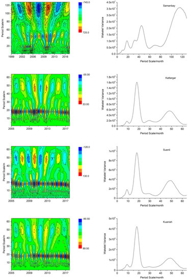 It can be known from Equation (4) that it can reflect the distribution of the energy of the signal fluctuation with the scale . Therefore, the wavelet variance figure can be used to determine the relative intensity of different scale disturbances in the signal and major time scale, which is the main period. The MATLAB package of wavelet analysis is provided by Grinsted [26].