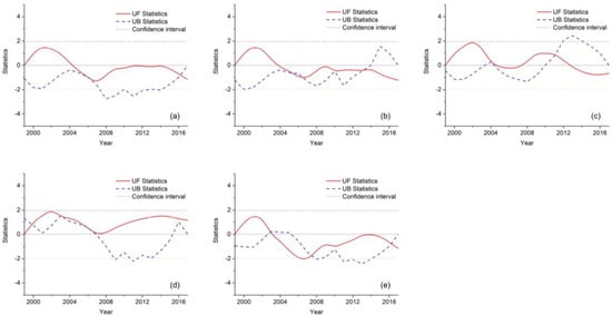 The M–K test is usually used to detect a series of trends in the long term of environmental data, climate data, or hydrological data [39]. The main advantage of the M–K test is that the sample does not need to obey any particular statistical distribution. The original hypothesis (H0) of the M–K test is that in the sample analyzed, there is no trend or serial correlation with the alternative hypothesis (H1), which assumes an increase or decrease in the monotonic trend.