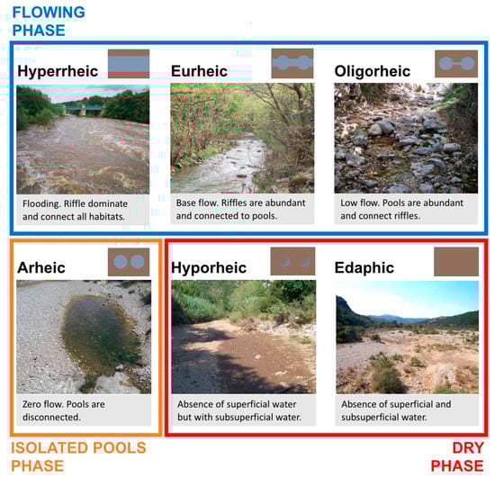 Aquatic states for temporary rivers according to Reference [] and their simplification in phases [,]. Photo credits: MIRAGE and TRivers projects.