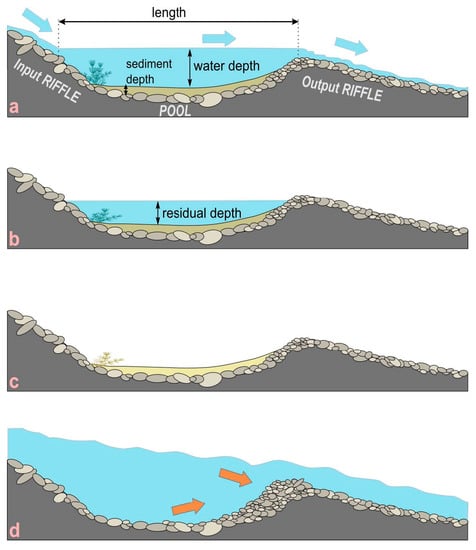 General geomorphological characteristics before (a), during (b), and after (c) the formation of an isolated pool, and with flow resumption (d). Blue arrows: water flow direction. Orange arrows: substrate mobilization direction. Modified from Reference [].