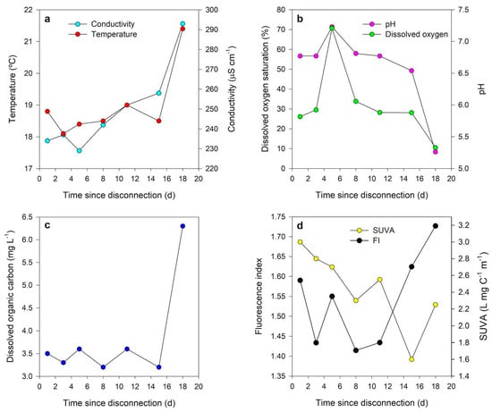 Temporal variation (i.e., time since disconnection in days), (d) of key physicochemical variables and dissolved organic matter (quantity and composition) in the surface water of an isolated pool (Fuirosos river, Catalonia, NE Spain). (a) Temperature and conductivity. (b) Dissolved oxygen saturation and pH. (c) Concentration of dissolved organic carbon. (d) Two indexes of DOM composition: Fluorescence index and specific ultraviolet absorbance (SUVA). The largest shift in most variables occurred just before complete surface drying (day 18). A short flow pulse on day 4 reconnected the isolated pool for 3 days, causing changes in some of the shown variables.