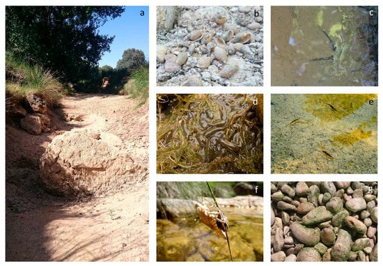 A dry isolated pool in the Guadazaón River (Júcar river basin, Spain) (a) and effects on the aquatic organisms. Some of them, such as molluscs (b), aquatic insects (c), or amphibians (d) without life cycles synchronized with drying are trapped in dry river beds and eventually die. Others, such as many heteropterans (e), are able to fly away and look for other aquatic refuges. Several species also have their life cycles synchronized and emerge before the IP dries up (f) (a larvae of Odonata) or stay in dry river beds as resistant forms until flow resumption (g) (benthic algae) []. Photo credits: N. Cid (a–c,f,g) and N. Bonada (d,e).