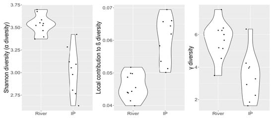 Comparison of alpha (i.e., Shannon diversity), beta (local contribution to beta diversity) and gamma diversity between independent perennial rivers (left) and isolated pools ((right), IPs) from California sampled simultaneously (data from Reference []).