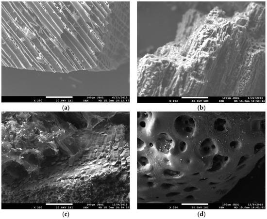 Scanning electron microscopy (SEM)—images of biochar derived from wood chips (a), garden green waste (b), corn cobs (c), and sewage sludge (d) at magnification 250× (with permission of authors—Micháleková-Richveisová et al. [91]).