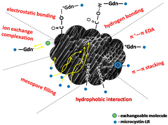 The mechanisms of sorption interactions between microcystin and biochar can be characterized by several potential processes such as electrostatic and hydrogen bonding, ion exchange, complexation, mesopore filling, hydrophobic interactions, and interactions with aromatic carbon (such as π ± π EDA and π − π stacking) (Figure 3). Π ± π EDA represents π ± π electron donor–acceptor interactions between protonated guanidine groups of MCs and π-electron rich graphene surfaces of biochar [28]. Π − π stacking is the main interaction between the benzene ring of MCs and aromatic units on biochar surfaces [74]. As mentioned previously, molecules of MCs have a more hydrophilic character with reactive carboxyl or guanidine functional groups. Therefore, the dominant mechanism of MCs sorption can be often attributed to hydrophobic interactions [74]. Liu et al. [28] reported that the hydrophobic leucine unit in a MC-LR molecule tends to be attracted to hydrophobic surfaces of giant reed-derived biochar via a hydrophobic interaction. The authors showed that the positive correlation between pyrolysis temperature and hydrophobic interactions, thus hydrophobicity, is a driving force in the sorption of MC-LR. Teixidó et al. [118] described sorption removal of hydrophilic sulfamethazine by biochar with electron donor–acceptor interaction between protonated aniline ring and on π-electrons rich carbon surface as the predominant driving force. However, this kind of interaction is not a major force during MCs interactions with biochar-based sorbents. Isolated π electron systems in the Adda side chain represent small fractions of the hydrophilic macromolecule.