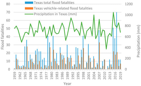 Numbers of annual flood fatalities and vehicle-related flood fatalities in Texas, 1959–2019.