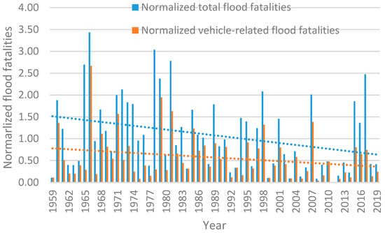 Normalized numbers of total flood fatalities and vehicle-related flood fatalities per 1 million people in Texas, 1959–2019.