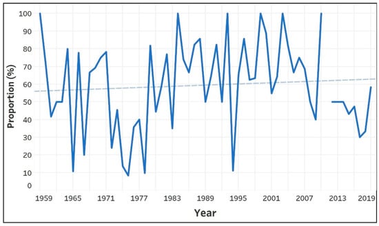 Annual proportion of vehicle-related flood fatalities for all flood fatalities in Texas, 1959–2019 (no flood fatalities occurred in 2011).