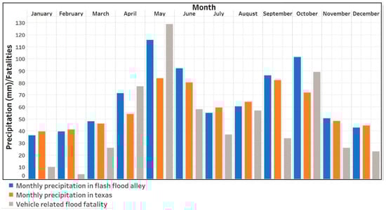 Monthly distribution of vehicle-related flood fatalities and average monthly precipitation in Flash Flood Alley and average monthly precipitation in Texas, 1959–2019.
