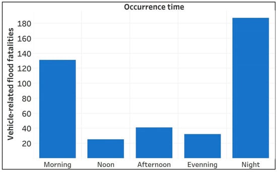 Among all the 570 vehicle-related flood fatalities during the study period, 416 (73%) were recorded with the time of the day they occurred. The timing of some storm/flooding events was described by the starting and ending hours. However, there is not enough detail regarding the storm movement and exact time of fatality. The time of occurrence is described as morning, noon, afternoon, evening, and night, without a specific description of the hour. Most likely these time periods correspond to 5:00 am–before noon (morning), around 12:00 pm (noon), noon to 5:00 pm (afternoon), 5:00 to 9:00 pm (evening), and 9:00 pm to 5:00 am (night). A large number of these vehicle-related flood fatalities with temporal details recorded (more than 45%) occurred at night (Figure 6) and 31% occurred in the morning, including the dark early morning hours. Sharif et al. [] found that a higher percentage (52%) of flood fatalities, with occurrence circumstances recorded, happened at night in Texas. The percentages are significantly lower for the afternoon and evening periods. Ahmed et al. [] found that the total percentage of vehicle-related flood fatalities that occurred in both the evening and at night accounted for 50% of those with known time details, while the morning hours accounted for only 8%.