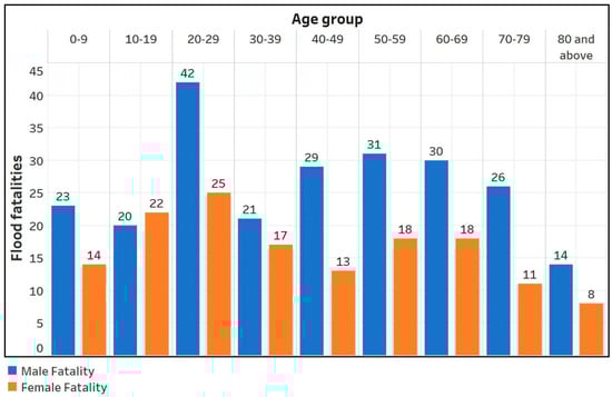 Storm Data provided information on the ages of individuals involved in 382 (67%) of the vehicle-related flood fatalities. The age group of 20–29 years covers the most vehicle-related flood fatalities for both male victims (42) and female (25), as seen in Figure 8. The age group of 80 and above is the group that has the lowest male (14) and female fatalities (8). Male victims are significantly more involved than females among all the age groups, except the 10–19 age group. For the age group of 40–49 and 70–79, the numbers of male victims are more than twice that of females. In general, victims of flood incidents characterized by active behaviors were, on average, younger by a significant margin than the ones that perish exhibiting a passive behavior [].
