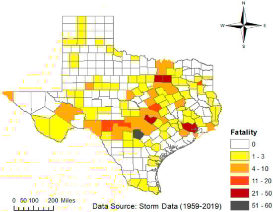 Vehicle-related flood fatalities by county in Texas, 1959–2019.