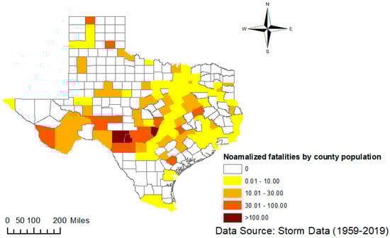 Normalized vehicle-related flood fatalities by county in Texas (per 100,000 residents), 1959–2019.