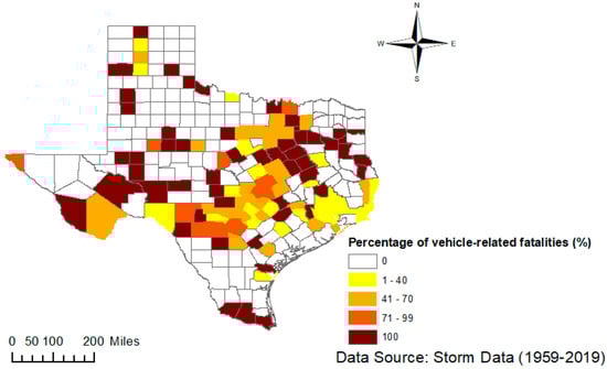 The proportion of vehicle-related flood fatalities in total flood fatalities by county in Texas, 1959–2019.