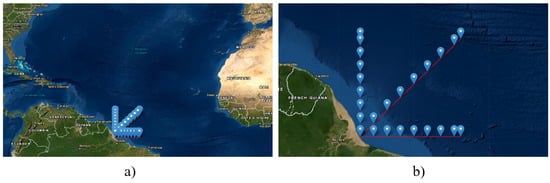 The area chosen for the analysis is 70.2 km away from the delta at a location of 49.46 W, 0.06 N as mentioned earlier. This particular region is measured in three dimensions, i.e., vertically, horizontally, and obliquely. The vertical computations initiated from the starting location of 49 W, 0.499994 N to 49 W, 7.974132 N, covering a distance of 833.91 km. The horizontal computations initiated from 49 W, 0.499994 N to 41.5 W, 0.499994 N, covering a distance of 834.33 km. Finally, the oblique computations initiated from 49 W, 0.499994 N to 41.5 W, 7.974132 N, covering a distance of 1177.33 km. These particular distances along the vertical, horizontal, and oblique lines are illustrated both globally and focused in Figure 1a,b, respectively. Similarly, the exact coordinates in latitude and longitude are depicted, where Lat And Long are abbreviated for latitude and longitude, respectively, and V, H, and O represent vertical, horizontal, and oblique, respectively, as depicted in Table 1 below: