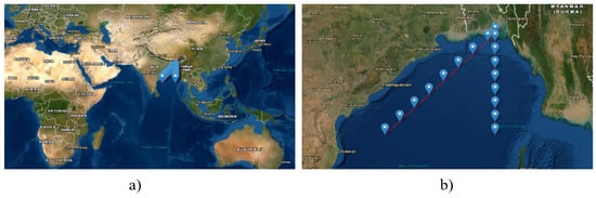 The area of experimental computations illustrating vertical and oblique dimensions in the BoB both globally in (a) and in focused form as (b) (Courtesy: https://earthexplorer.usgs.gov).