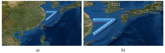 The computational activity near the Yangtze river took place 105.16 km away from the shore at the location of 121.9 E, 31.3 N. This activity was conducted by considering both horizontal and oblique dimensions. The horizontal computation of salinity initiates at 123 E, 31.3136 N to 128 E, 31.3136 N, covering a distance of 474.885 km. Similarly, the oblique line starts at 123 E, 26.94775 N to 128 E, 31.3136 N, covering a distance of 685.13 km. The locations both on the global scale and in focused form are illustrated in Figure 3a,b, respectively. Similarly, the exact coordinates in latitude and longitude are depicted, where Lat And Long are abbreviated for latitude and longitude, respectively, and H and O represent horizontal and oblique, respectively, as depicted in Table 3 below: