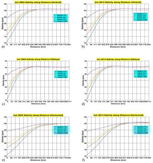 Comparative analysis of the halocline for multiple layers, i.e., 1, 3, 5, and 10 m, for 2004 and 2014 in the month of June near the Amazon estuary for vertical stretches as (a,b), oblique stretches as (c,d), and horizontal stretches as (e,f).