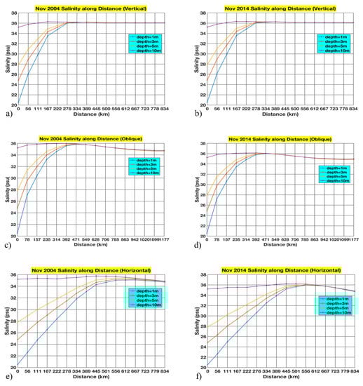Comparative analysis of the halocline for multiple layers, i.e., 1, 3, 5, and 10 m, for 2004 and 2014 in the month of November near the Amazon estuary for vertical stretches as (a,b), oblique stretches as (c,d), and horizontal stretches as (e,f).