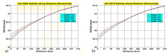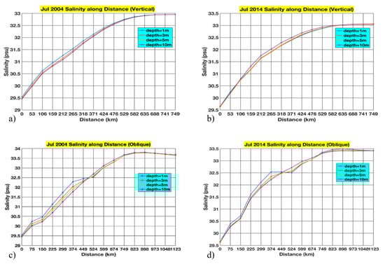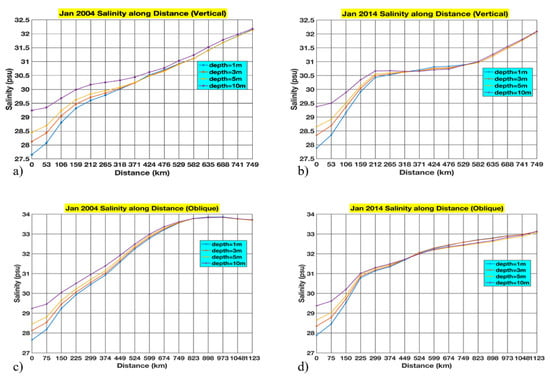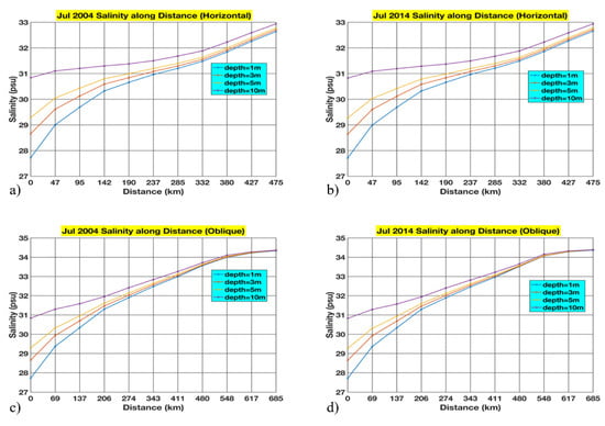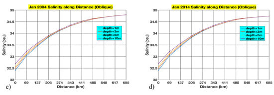 As mentioned earlier, Yangtze is the longest river in China and constitutes the biggest estuary by comprising three bifurcations and four channels into the East China Sea [21]. Sun et al. undertook the environmental flow depending on the salinity objectives for the Yangtze estuary of China to analyze the effects of varying freshwater discharge on the estuarine ecosystem. They mentioned strong correlations between freshwater influx and the salinity gradient, as well as correlation between salinity and a large variety of kinds of biological productivity [32]. This particular section of our study is dedicated to compute and compare haloclines for the Yangtze Estuary during the months of July in 2004 and 2014, as well as January in 2004 and 2014, as illustrated in Figure 9 and Figure 10, respectively. These comparative analyses are conducted horizontally to a distance of 475 km from the estuary and obliquely 685 km from the initial observation location. The halocline comparisons are exhibited in five layers as done in previous experimentations, i.e., 1, 3, 5, and 10 m. The outcomes in Figure 9 and Figure 10are illustrated for horizontal computations as (a) and (b) and oblique computations as (c) and (d). The outcomes illustrated in Figure 9 and Figure 10 exhibit the salinity deviations according to the literature regarding the freshwater influx during the months of July and January, respectively [21,33]. Moreover, a slight difference is observed between 2004 and 2014 comparisons in the months of both July and January.