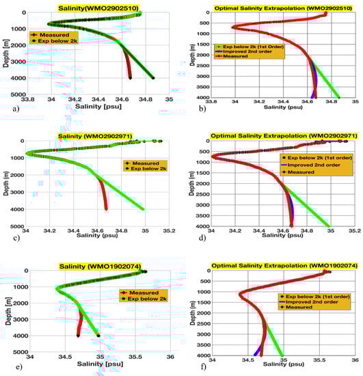 The application of the basic first-order method to extrapolate the salinities below 2000 m is illustrated in (a,c,e). Similarly, the improved second-order polynomial is employed to further rectify the anomalies, and the improved results are presented in (b,d,f).