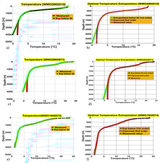 The salinity in the ocean is a sign of variations in the worldwide hydrological cycle and extensive climate perturbation. The spread of salt in the ocean along with its temporal discrepancy is crucial for comprehending Earth’s weather. The thermohaline circulation along with the spread of heat and mass is critically dependent on the salinity of the ocean. In addition, temperature along with salinity and pH are crucial to the existence of the majority of marine flora and fauna and, hence, are critical parameters for the observation of water [23,35]. In this regard, temperature is extrapolated below 2000 m analogous to the extrapolations of salinity conducted for the Argo floats presented in Table 4. These temperature extrapolations are illustrated in Figure 12a,c,e for the aforementioned basic first-order method for Argo floats of WMO2902510, WMO2902971, and WMO1902074, respectively. Similarly, the improved second-order polynomial is employed to rectify the anomalies, as illustrated in Figure 12b,d,f, respectively. As mentioned earlier, such extrapolations for both salinity and temperature may pave the way for the broader spatiotemporal coverage of assessing varying regions of the ocean by taking into consideration the core as well as deep Argo programs.