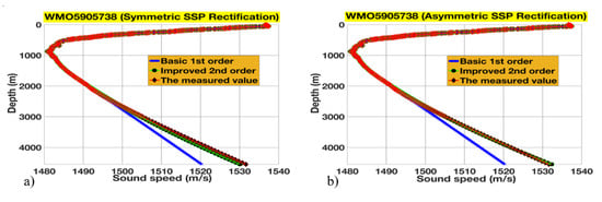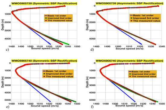 The sound speed profiles (SSPs) from symmetric extrapolations were rectified by asymmetric extrapolation, resulting in an improvement of ~2 m/s to become almost identical (a,b). Similarly, an improvement was observed from ~7 m/s to negligible difference (c,d). Finally, a difference of ~5 m/s was improved to ~1 m/s, as illustrated in (e,f), respectively.