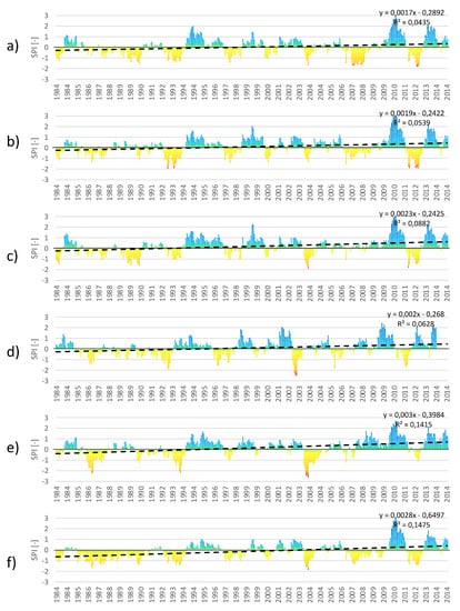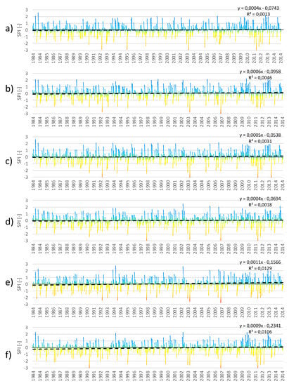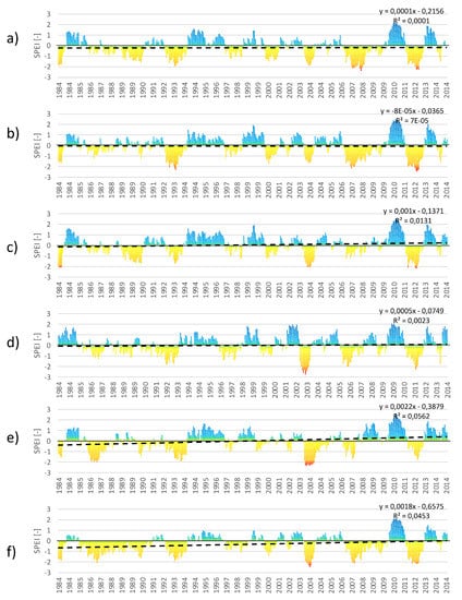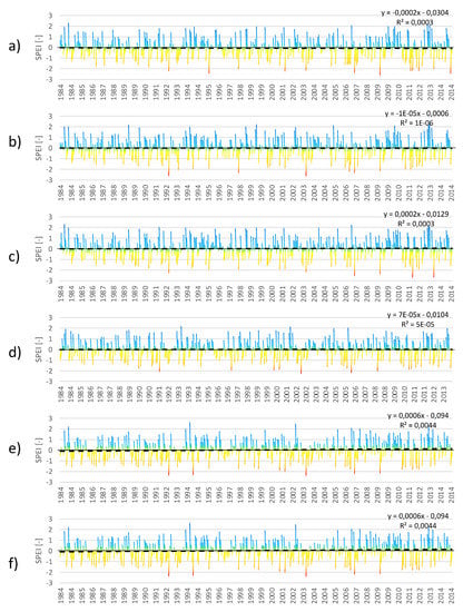 3.3. Trend Analyses of SPI and SPEI for Individual Months in the Period 1984–2014