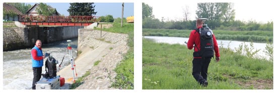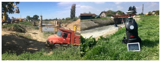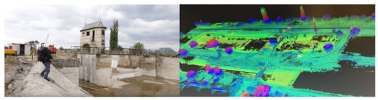 This type of measurements performed using the TLS technique, namely MMS are the first of its kind in Romania, being for the first time when applied for this field, pioneering this way in the field of hydrotechnics in Romania, especially for the Banat Water Basin Administration who manages through this scanning work in order to create a digital data base, which will be used for achieving some projects regarding virtual reality (VR—Virtual Reality) namely achieving BIM (building information modelling) projects [,,,,], considering the fact that before starting the rehabilitation works of Sânmihaiu Român Hydro technical Node, two scans were performed using the Leica C10 terrestrial laser scanner as well as a mobile scan using the Leica Pegasus Backpack scanner. There will also be a 3D scan with the Leica Pegasus Backpack mobile scanner at the end of the rehabilitation works, for the revitalization of the Bega River and for tourist navigation, including by capitalizing on tourist locations thus creating unlimited opportunities for development of the area with at least two advantages to complete two European projects already underway: the first project being the one through which the bicycle track was made along the Bega canal, a work in which the authors participated for the topographic surveys on a length of 36 km and the realization of the compensations, respectively the situation plans. The second project, called the Eco Timiș project, is the one that promotes in Timiș the partnership with Serbia as a tourism area. In this context, the 3D scan was performed for the Sânmartinu Maghiar Hydrotechnical Node, located 15 km (from the bicycle track) compared to the Sânmihaiu Român lock.