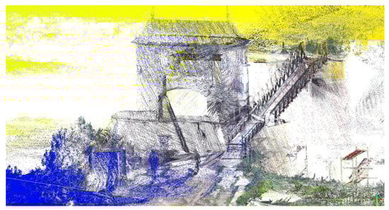 If in the case of engineering photogrammetry point cloud are obtained from aerial images collected with the drone (Phantom 4 Pro) and processed with the AgiSoft PhotoScan Professional program, in the case of mobile MMS scanning technology, where we used a Leica Pegasus backpack, point cloud are obtained from the two Velodyne type scanning systems [], each one equipped with 16 LiDAR data acquisition lasers (LiDAR SO + LiDAR SA), at an accuracy of a few millimeters, and the images obtained from the 5 cameras will be used to color LiDAR dots, from the raw shape, which has bright red, yellow, and green colors, to a real shape, where each LiDAR dot will be colored based on the pixels from the images, in a split second. The same thing happened with the use of TLS technology, where a Leica ScanStation C10 equipment was used to scan the hydro technical objective, with the following clear differences (Table 1).