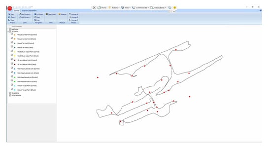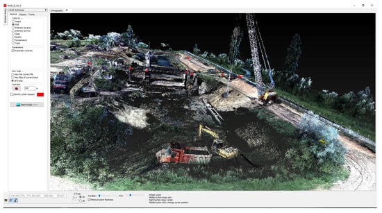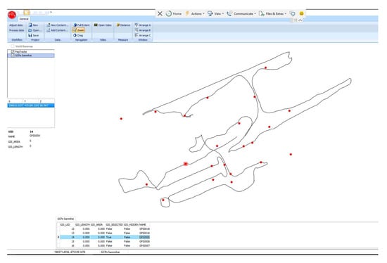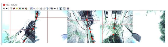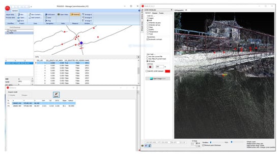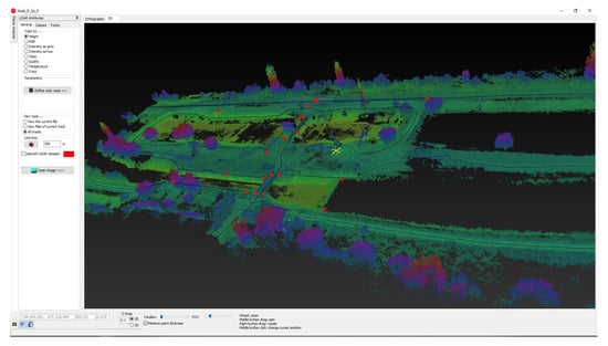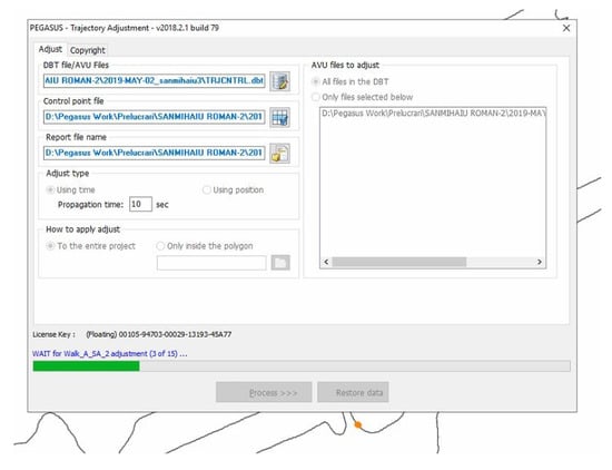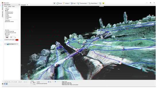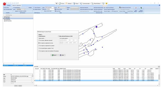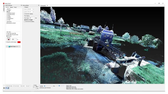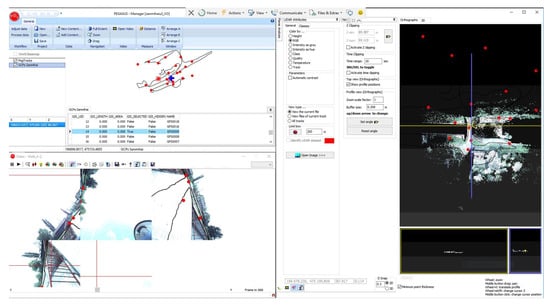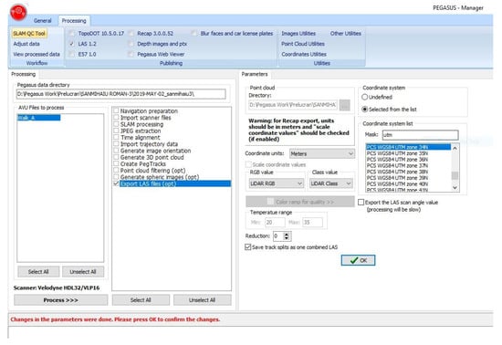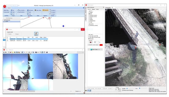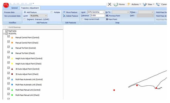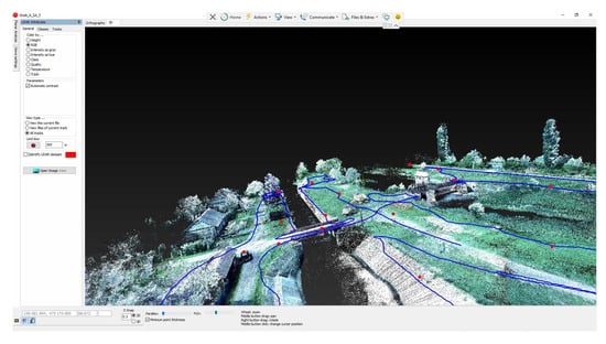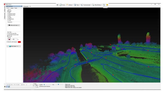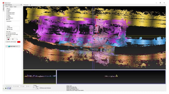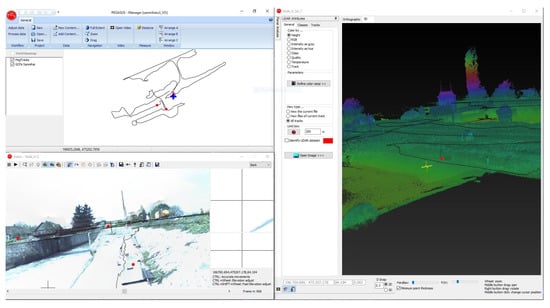 Post-processing data is done in two main stages: first, GNSS and IMU data are integrated to calculate the MMS trajectory (position and rotation of the SPAN platform) as a starting solution and later to calculate optimization, taking into account 3D profiles from both linear scanners. For the first step, inertial Explorer software (from Novatel) [] is used, then the data is processed by Leica Pegasus software, namely Pegasus Manager.