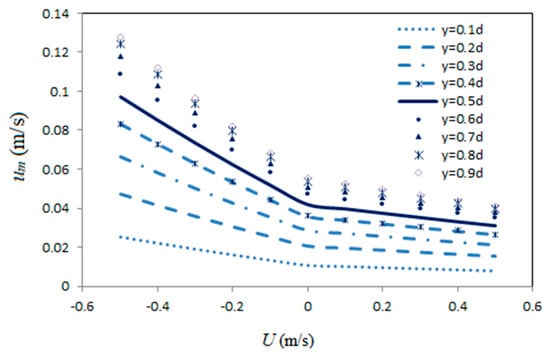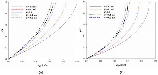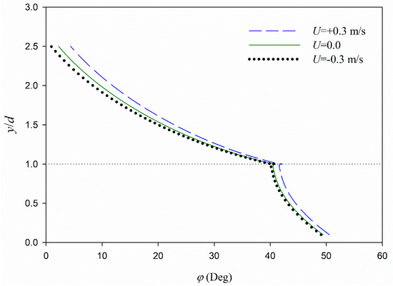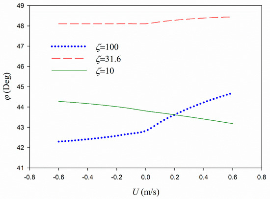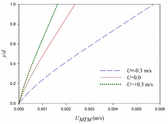 Profiles of mud maximum particle velocity for two different values of ζ show that the velocity profile approaches a vertical slope at the mud interface (i.e., providing zero shears) in the case of smaller viscosities (e.g., higher values of ζ, Figure 2). However, a fully shear layer is formed in the case of lower values of ζ (Figure 2). Besides, it is seen in the figure that the following current provides lower values of particle velocities compared to the no current and opposing current cases. The first term at the right-hand side of Equation (26) represents the effect of current on mud particle velocities.