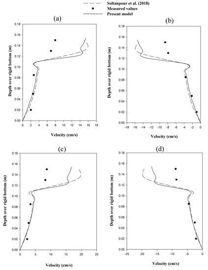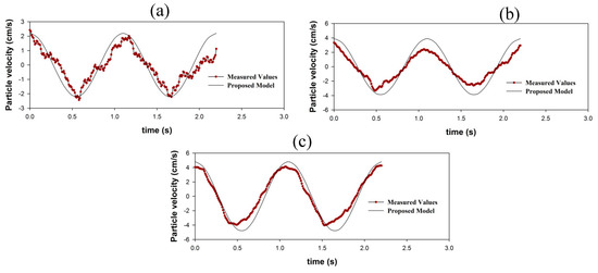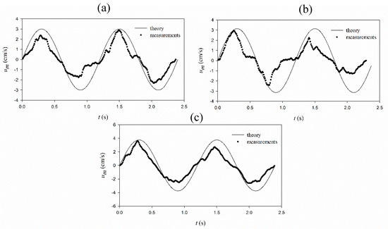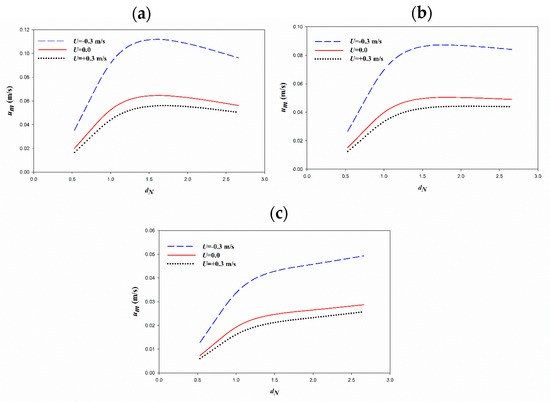 As discussed in Figure 2, by an increase in the current velocity, the particle velocity amplitudes are decreased (confirmed by Figure 3). This is because, by an increase in the current velocity, the wave length is increased, which results in a decrease in the mud movements. In addition, it is observed in the Equation (26), that by an increase in the current velocity, the relative frequency, ω is decreased, which results in the decrease of particle velocity (the first term at the right-hand side of Equation (26)). A similar trend was reported by An and Shibayama [26], with the same slope in the opposing and following currents. Particle velocity amplitudes versus dimensionless mud thickness are comparable with the results of dissipation rates (versus dimensionless mud thickness) provided by Ng [15] (Figure 4). As can be seen in the figure, the particle velocity values increase by an increase in the dimensionless mud thickness and then decrease. There is a local peak in dimensionless mud thickness around dN = 1.2. The local peak is comparable to the model outputs for the dissipation rates of regular water waves versus the dimensionless mud thicknesses (e.g., [11,15]). By going deeper into the mud layer, the decrement phase is not obvious (e.g., the velocity amplitude remains constant or becomes ascending, corresponding to Figure 4b,c). This is relevant to the fact that deeper parts of the mud layer experience lower interactions with the water layer compared to the shallower parts and also to the fact that the current velocity is an order of magnitude larger than the wave-induced velocity (i.e., ).